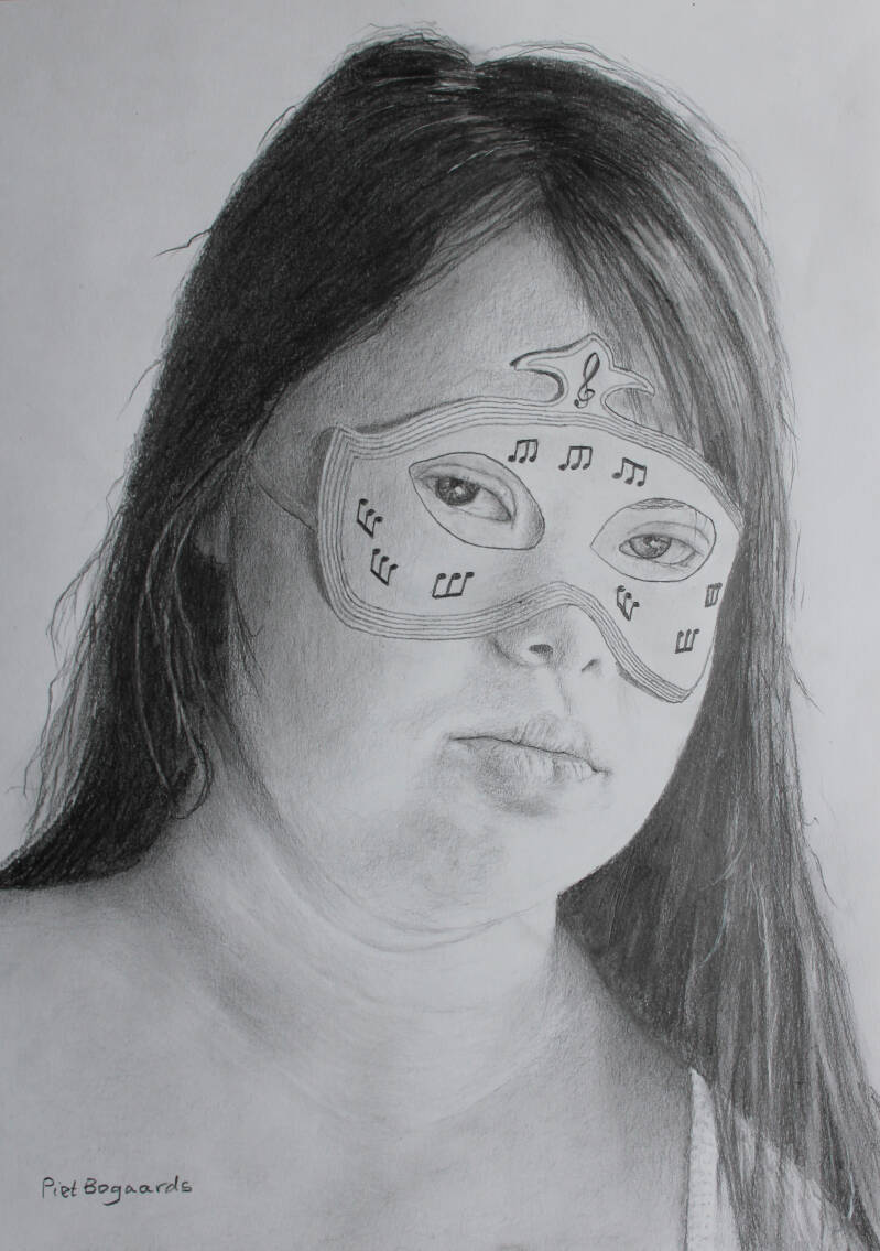 Het kenmerk van mensen met het Syndroom van Down is, dat zij in elke cel van hun lichaam drie exemplaren van het Chromosoom-21 hebben in plaats van twee. Dat derde exemplaar veroorzaakt de Down-kenmerken. Ik heb deze chromosomen als muzieknoten op het masker afgebeeld. Drie maal drie triolen, een verwijzing in het kwadraat naar de kinderlijke onschuld die wat mij betreft het voornaamste kenmerk is van deze bijzondere mensensoort.